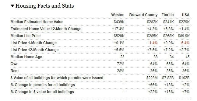 Median Estimated Home Value in Weston (as of April 5th 2018) is now $439,000 up 17.4% from last year and Median Days in the market sits at 100 days.